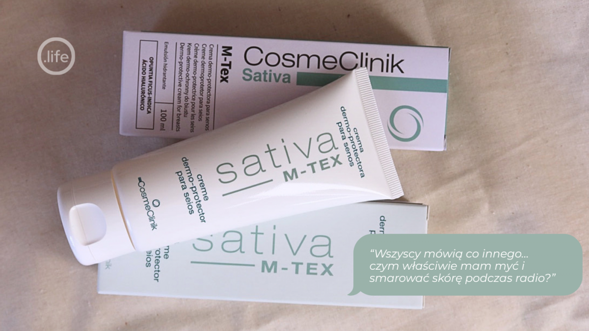 – przy naświetlanych obszarach – SATIVA M-TEX, który wspiera barierę skóry i zapobiega pogłębianiu zmian popromiennych,