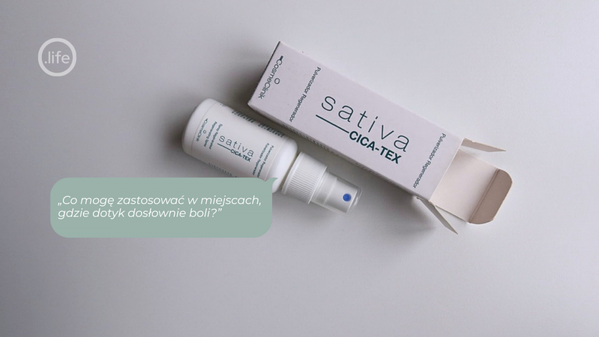 – przy miejscowym bólu, swędzeniu i nadwrażliwości (np. w okolicy blizn) – punktowe wsparcie regeneracji za pomocą SATIVA CICA-TEX (emulsji lub sprayu), który tworzy delikatny film ochronny.